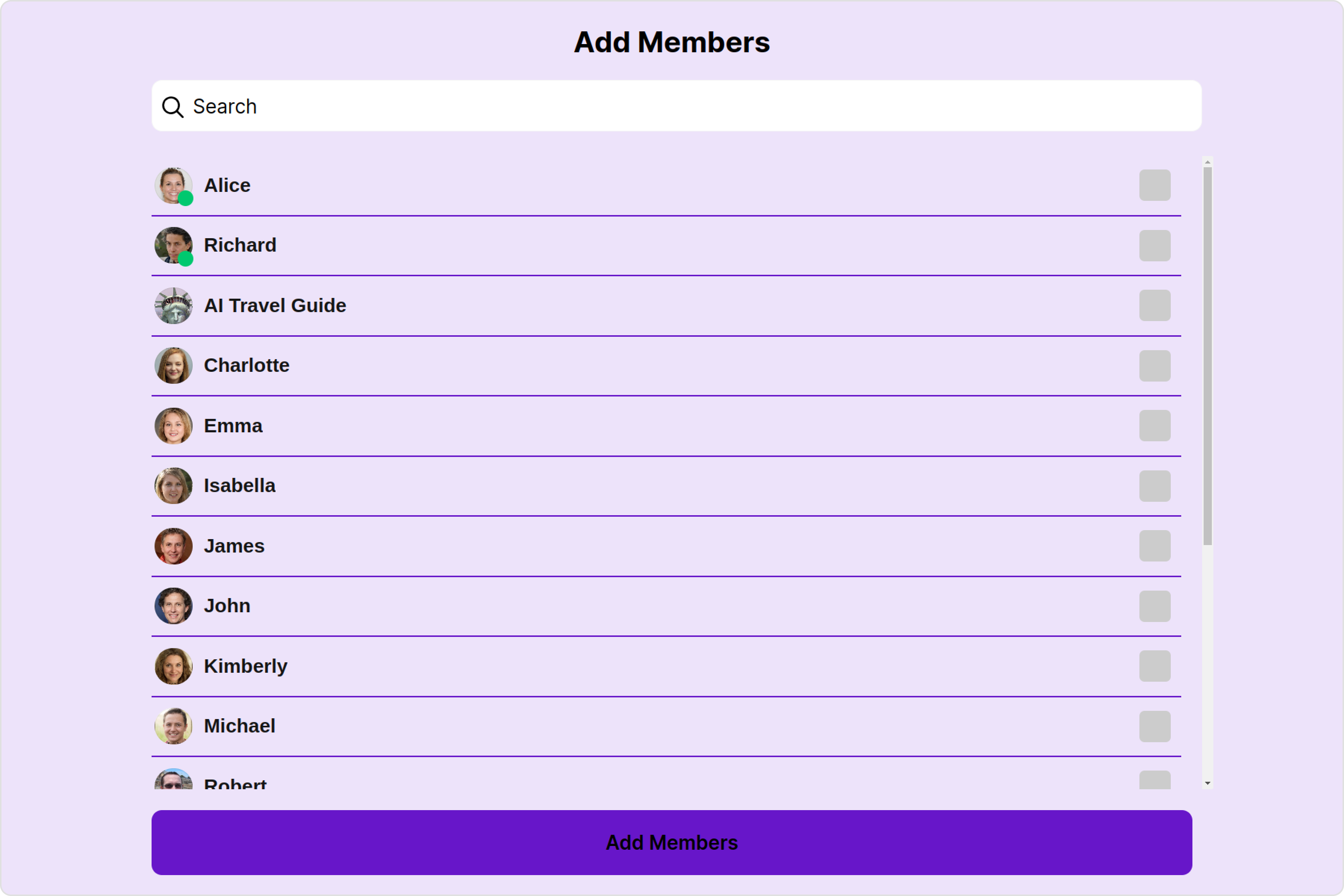 To fit your app’s design requirements, you can customize the appearance of the Add Members component. We provide exposed methods that allow you to modify the experience and behavior according to your specific needs.Style