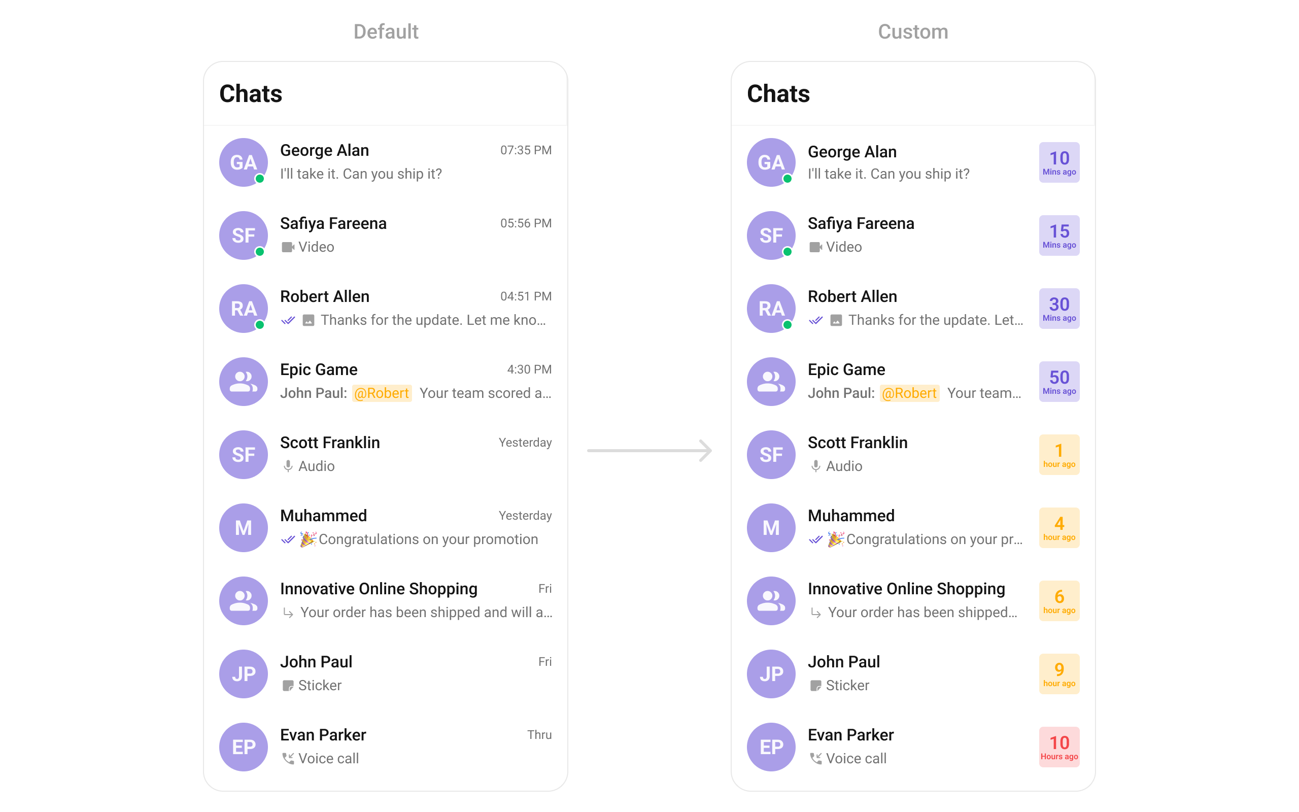 | Date Pattern | Used to display a custom string instead of the timestamp show at the tail of the conversation item | datePattern: String Function(Conversation conversation) |