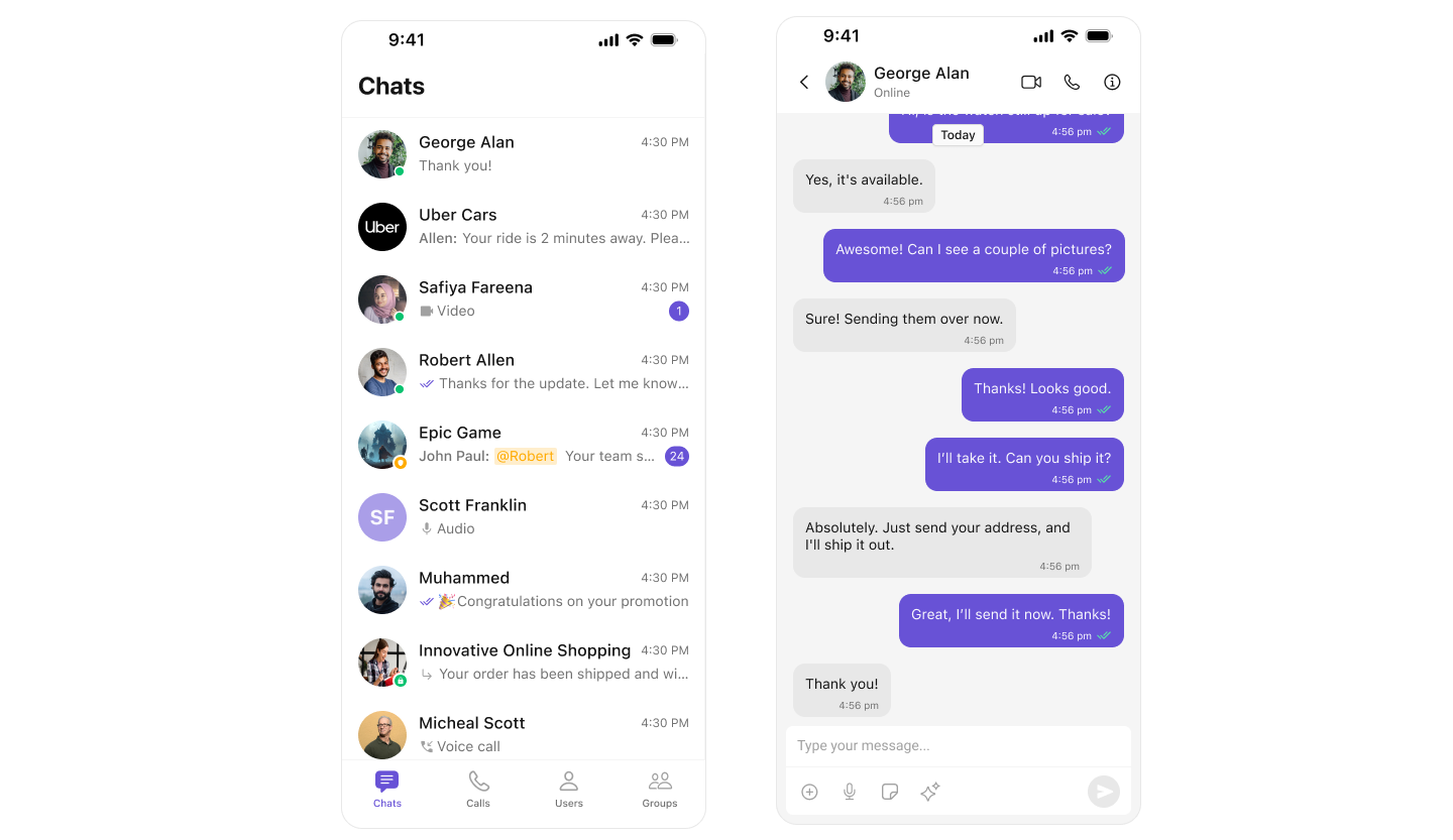 Best for: iOS apps needing a multi-tab interface with seamless transitions between Chats, Users, Calls, and Settings. Highlights:- UITabBarController or SwiftUI TabView – Native navigation pattern for iOS.