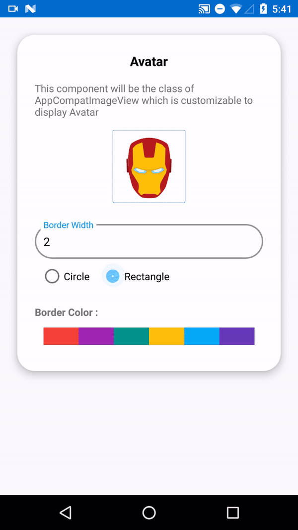 | Avatar | app:avatar``# setAvatar(@NonNull User)``# setAvatar(@NonNull Group)``# setAvatar(@NonNull String)``# setAvatar(@NonNull Drawable, @NonNull String) |
