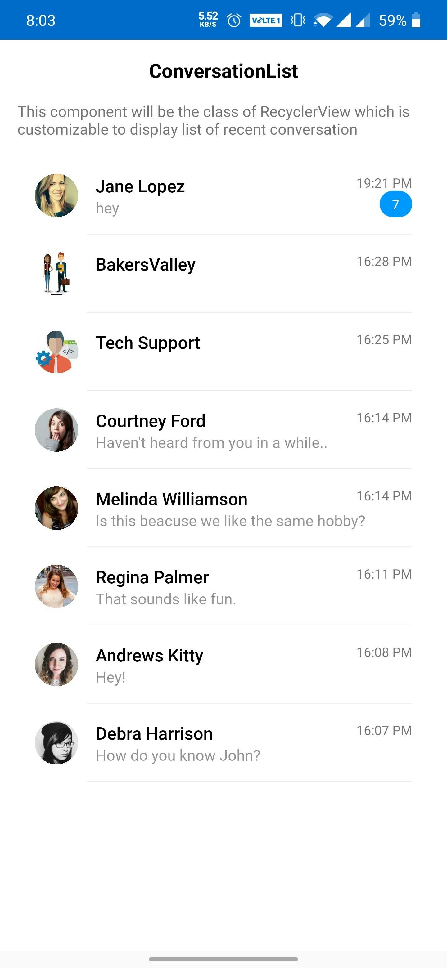 CometChatConversations is a custom RecyclerView which will help you to display a list of all the users and groups in which the logged-in user has made any conversation.